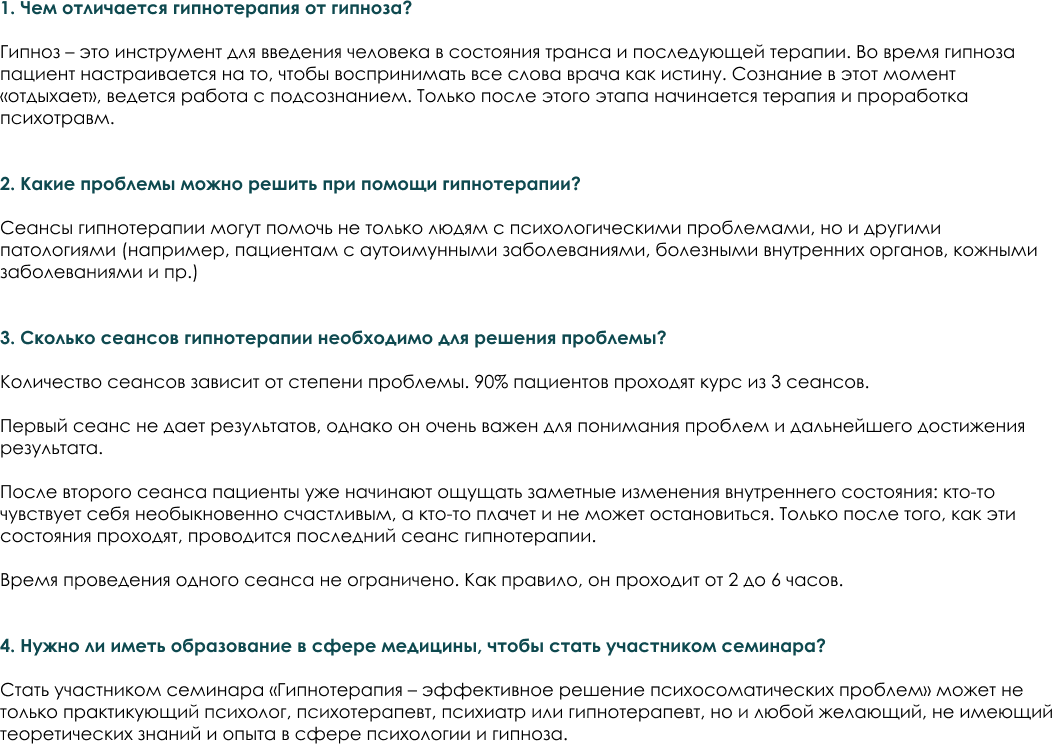 3. Чтобы освоить навыки проведения гипнотерапии, не нужно обладать профильным образованием в сфере медицины. Поэтому прием на курс ведется без ограничений в уровне образования.